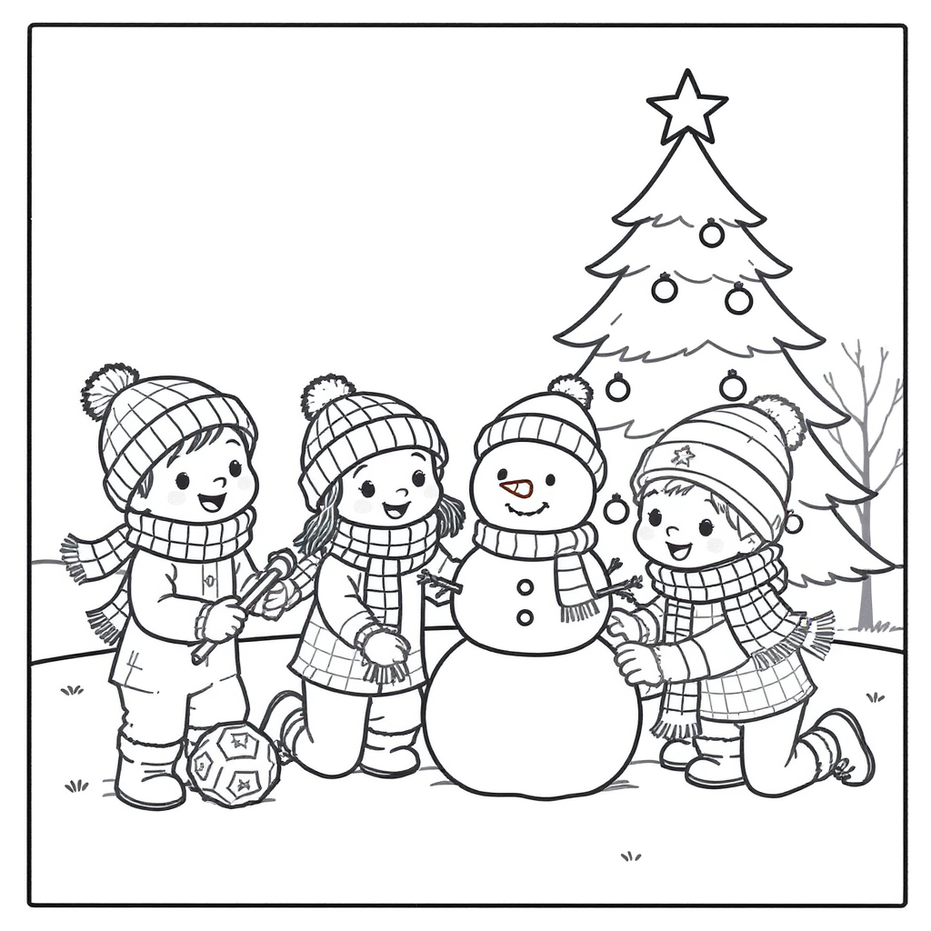 Children wearing cozy scarves building a snowman beside a decorated Christmas tree in a park