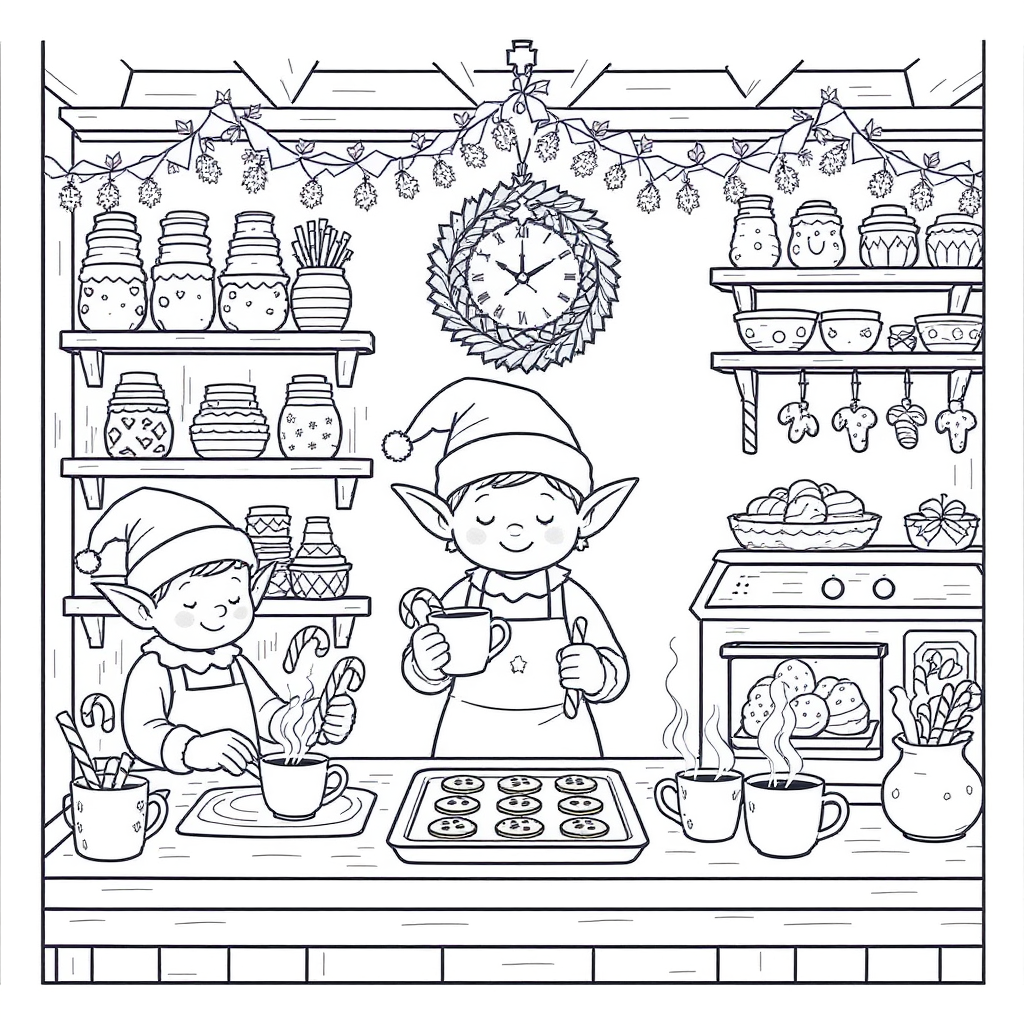 Elves frosting gingerbread and candy canes inside a bustling Christmas bakery with cocoa on the counter