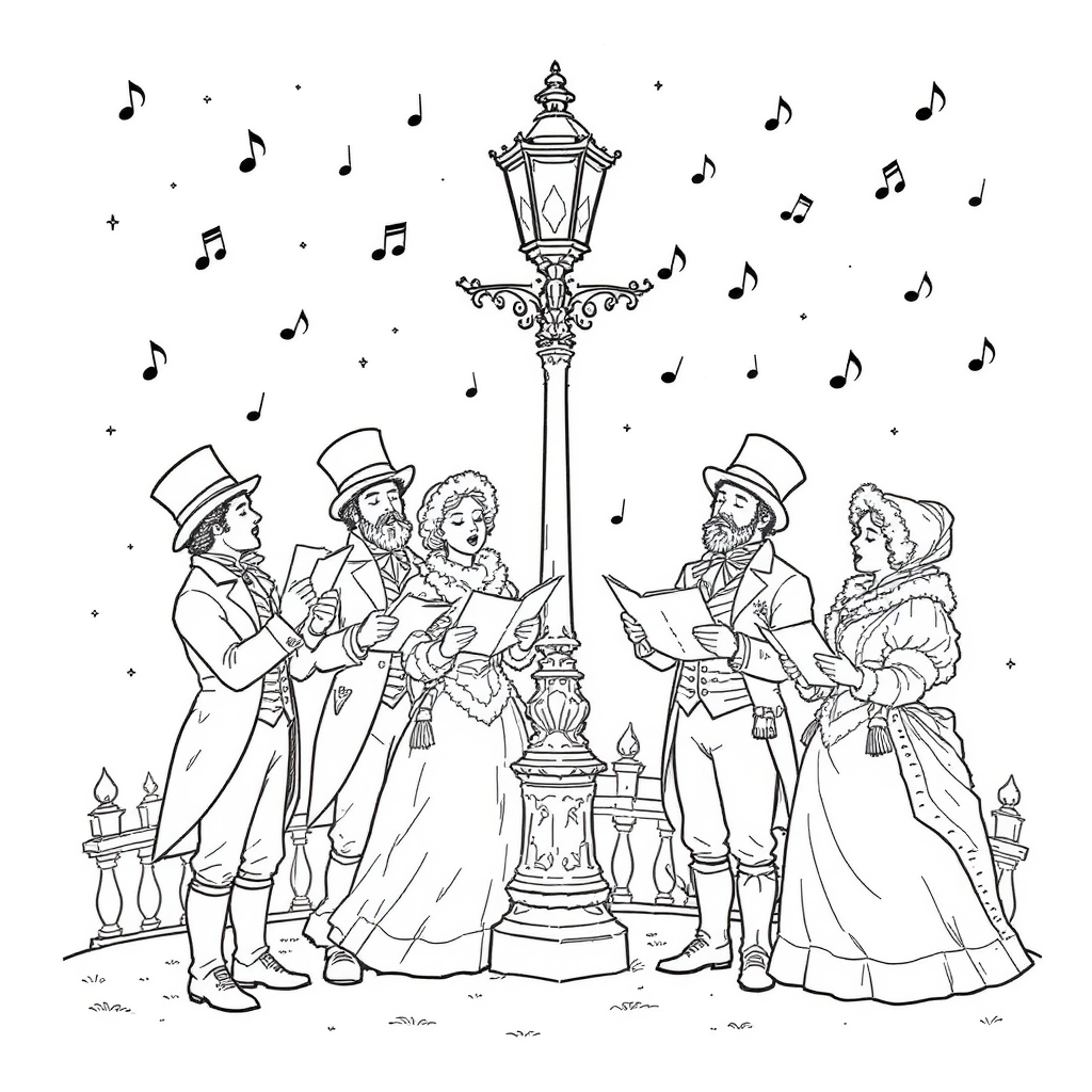 Victorian carolers harmonizing around a lamppost, snow drifting through the night air and music notes