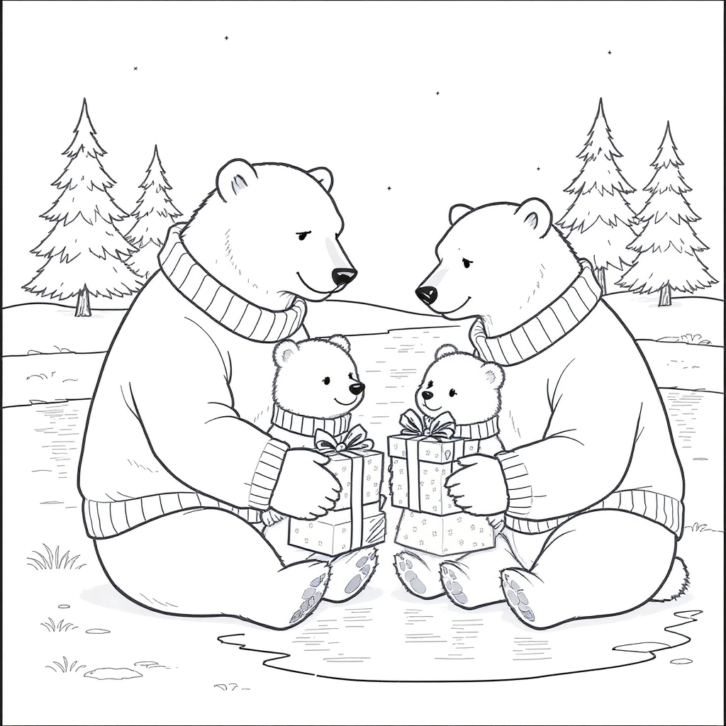 Polar bear parents and cubs trading gifts near an icy pond with tall evergreen trees in the background