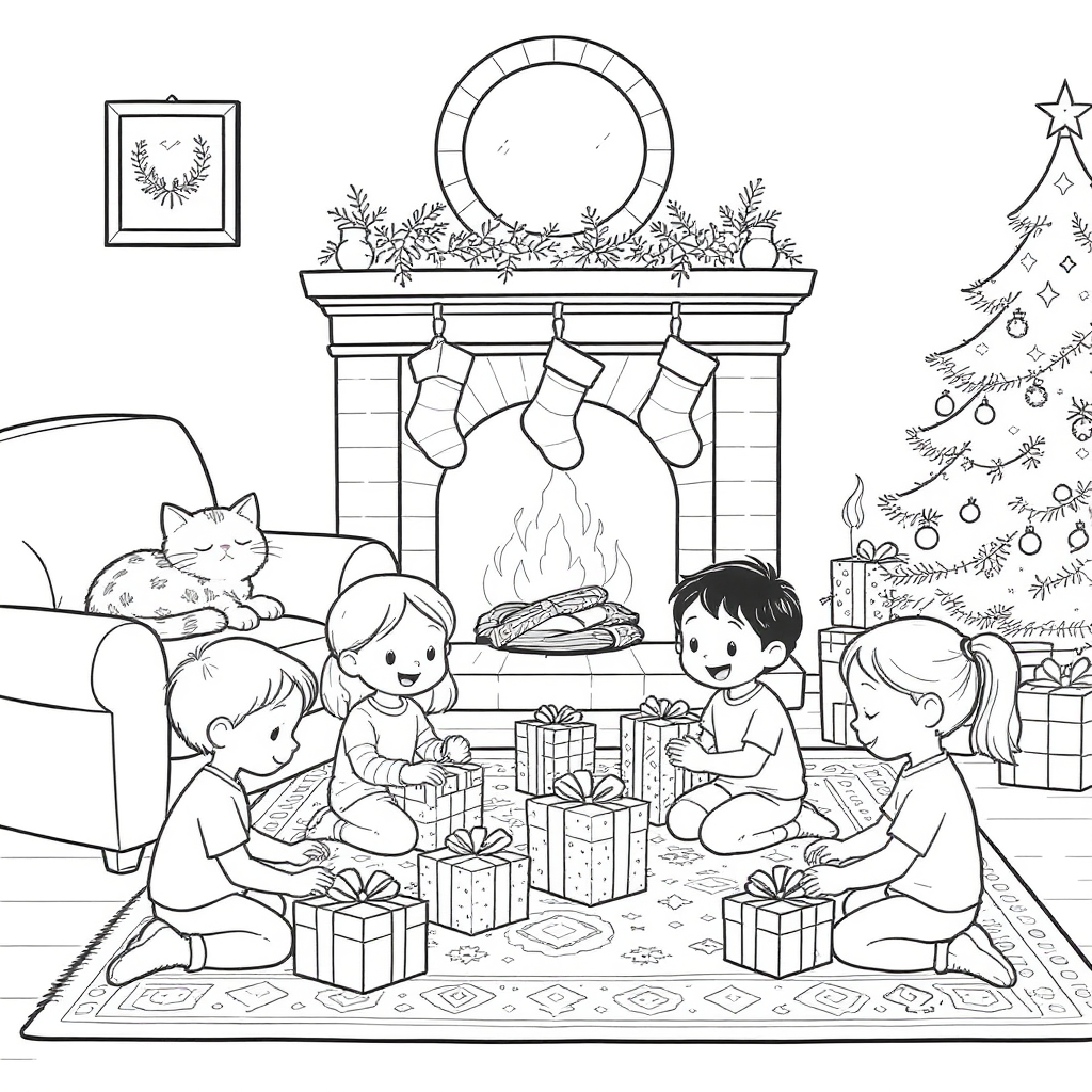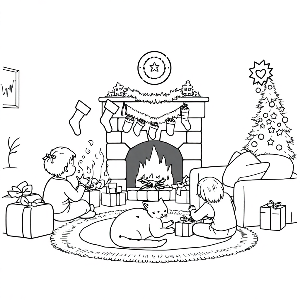 Cozy living room with fireplace, stockings, and a cat curled on a rug as kids unwrap presents