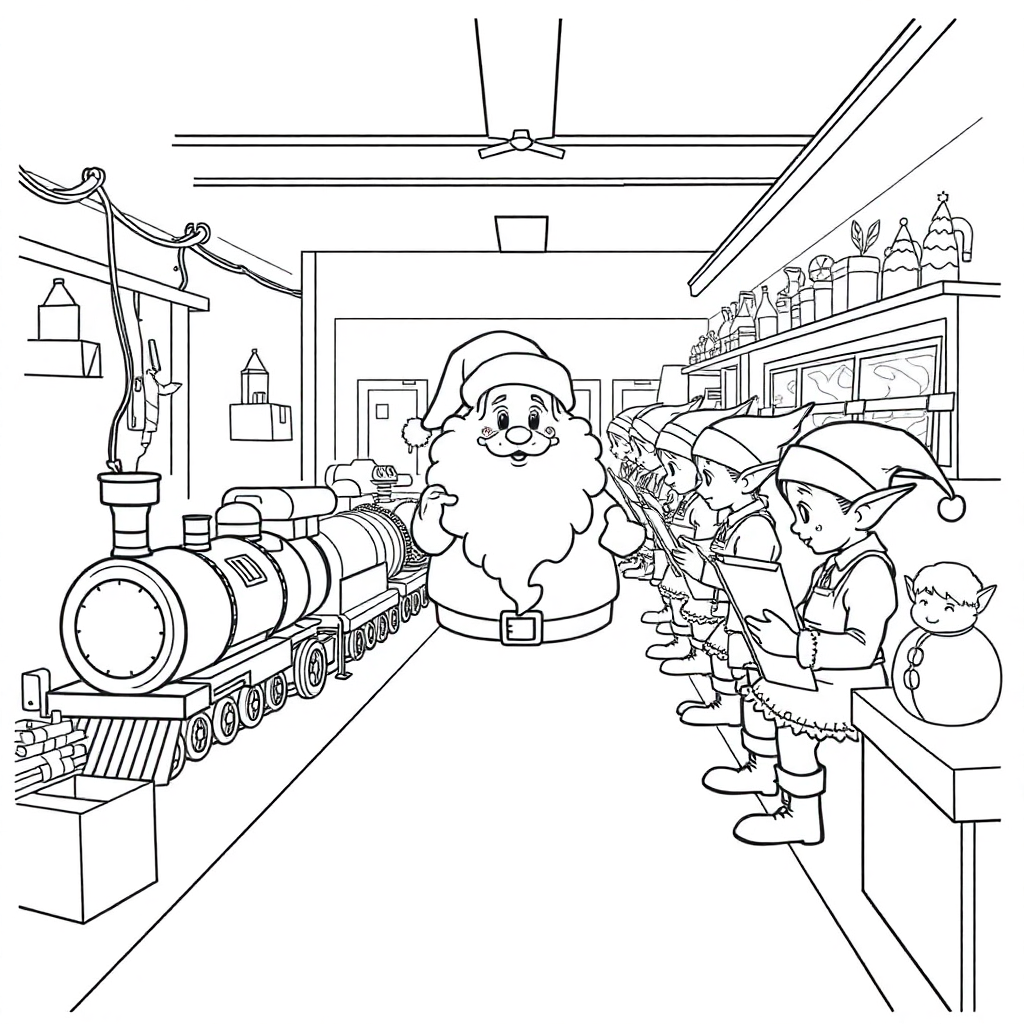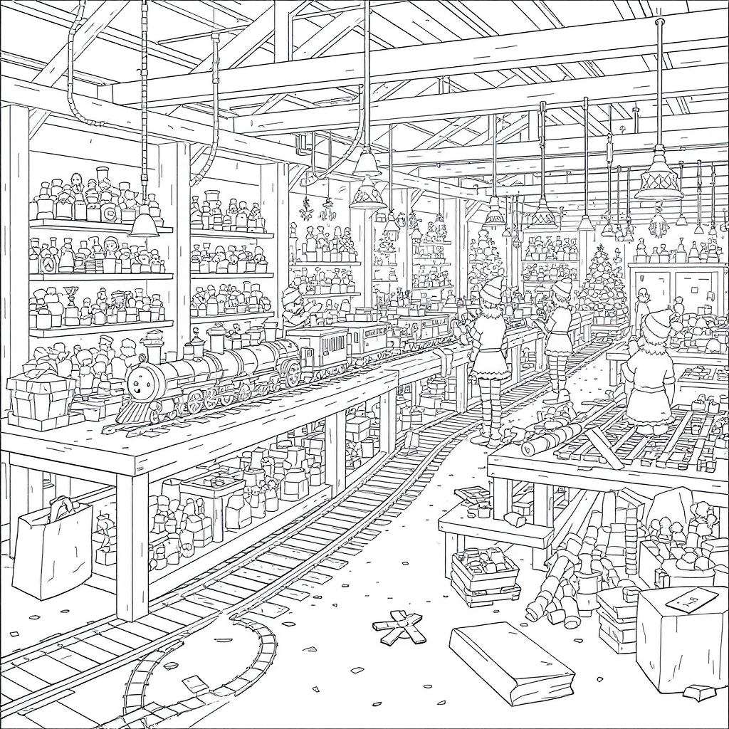 Santa's workshop assembly line with toy trains, dolls, and elves checking lists with clipboards