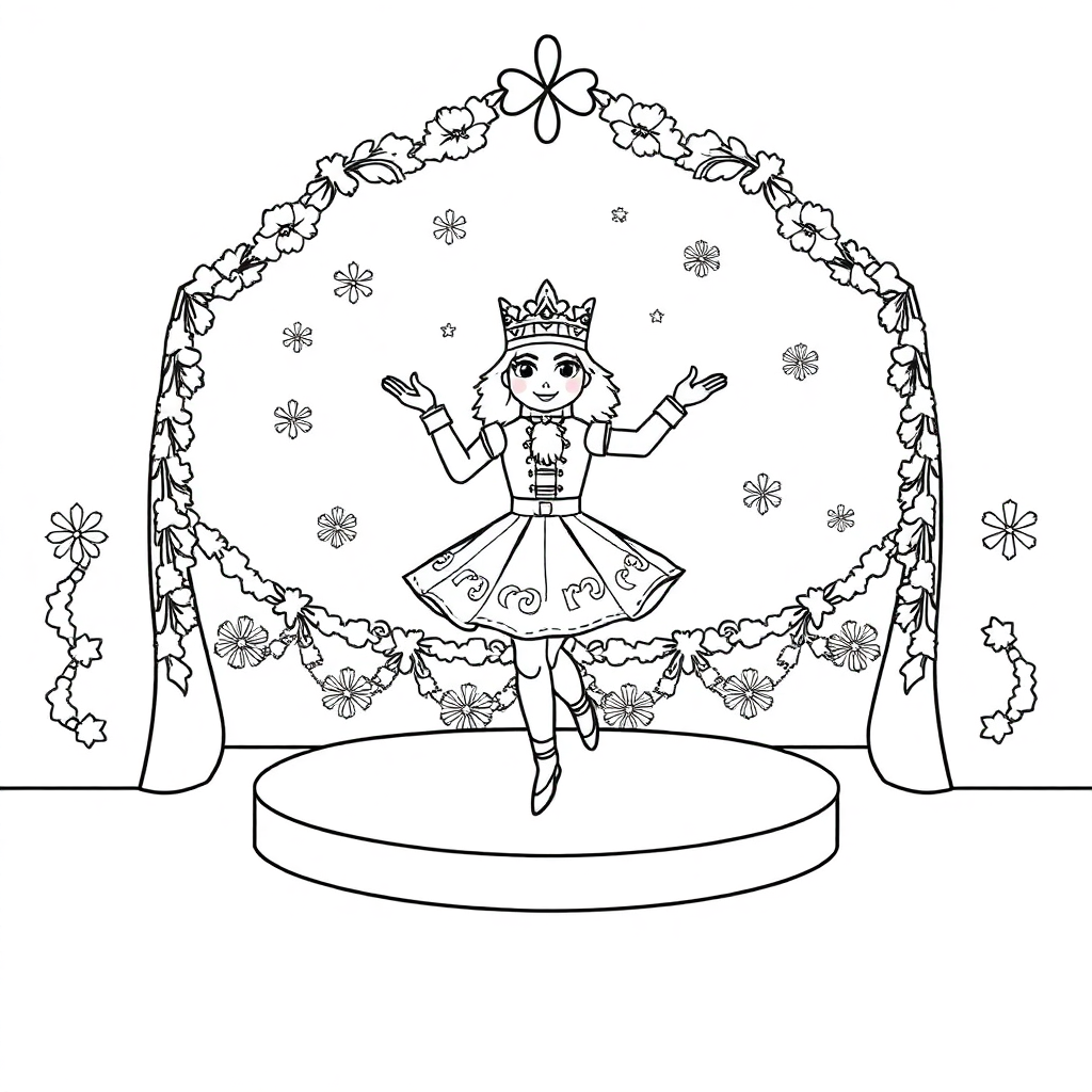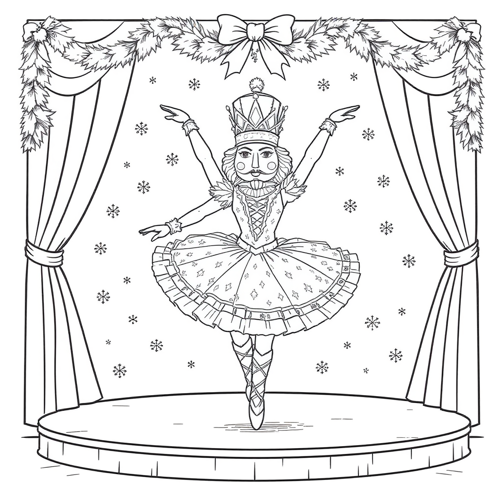 Nutcracker ballerina dancing on a stage framed by garlands, snowflake patterns swirling around