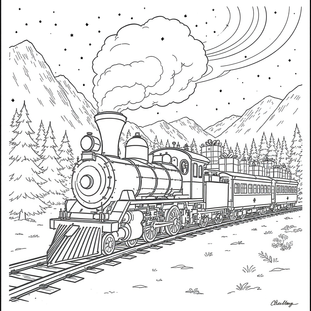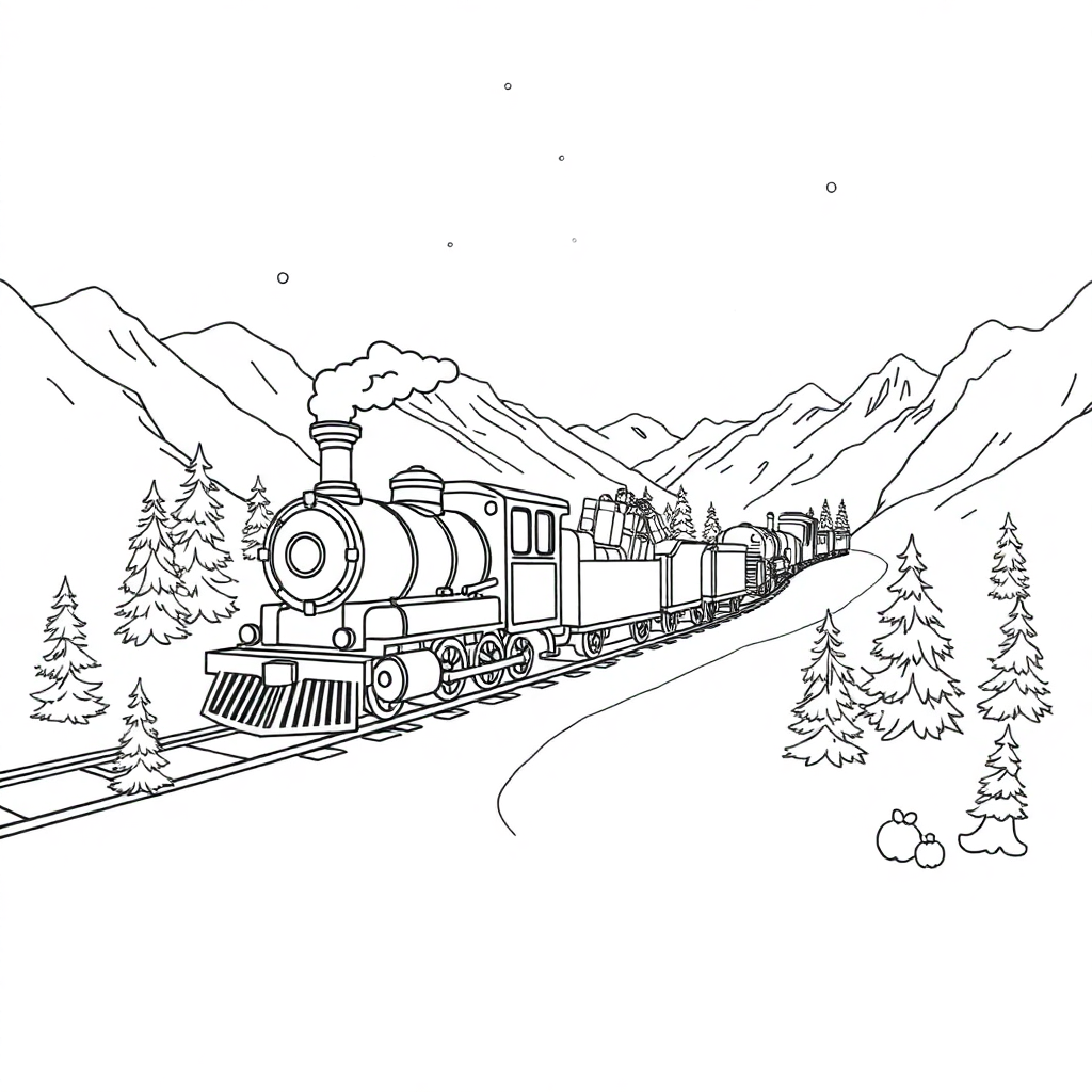 Holiday steam locomotive delivering presents through snowy mountains as the sky glows with aurora light