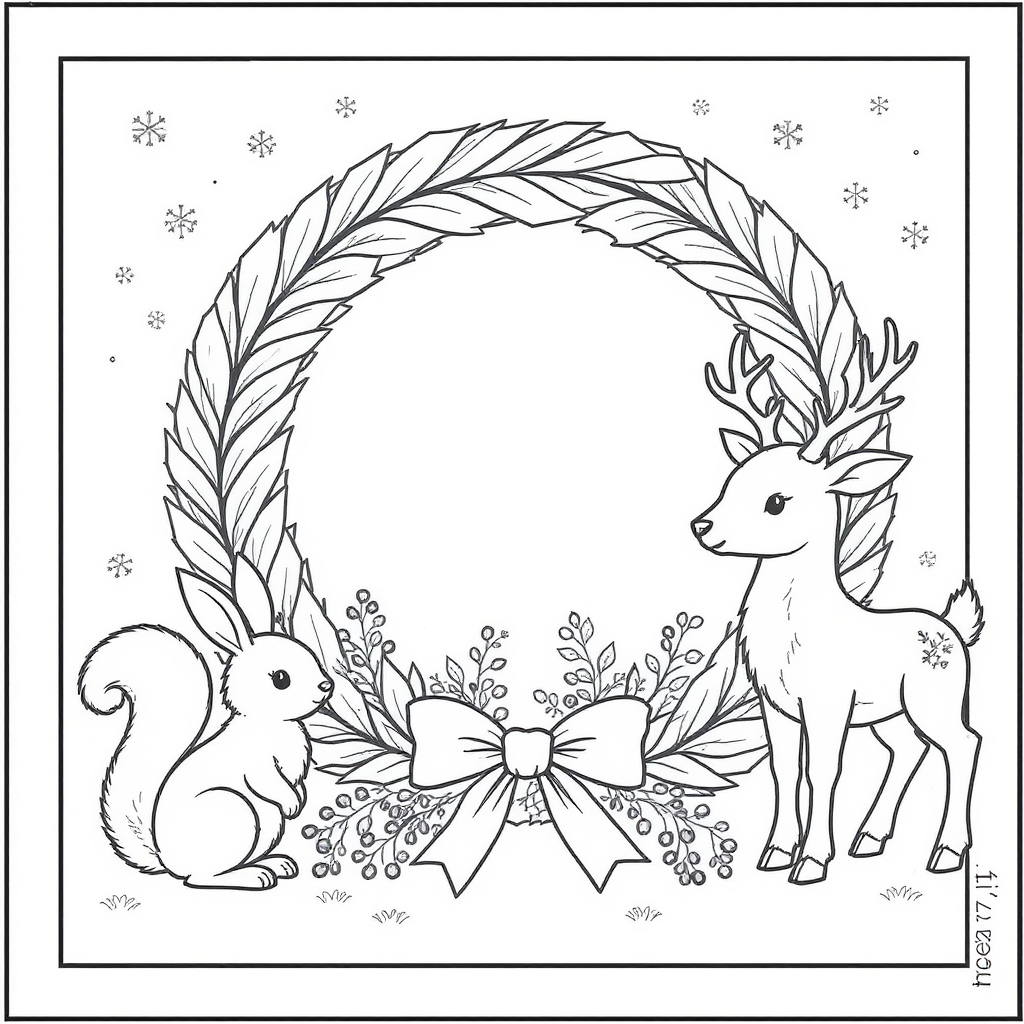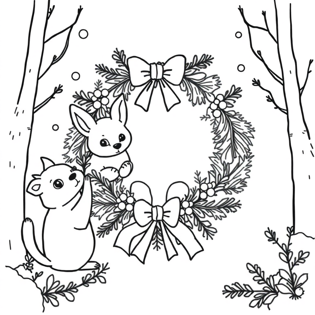 Woodland animals decorating a wreath with berries and ribbons while gentle snow falls in the forest