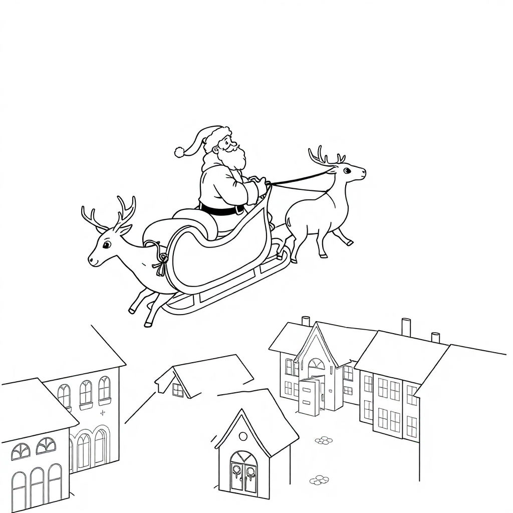 Santa Claus guiding his reindeer sleigh above a snow-covered town square with twinkling lights