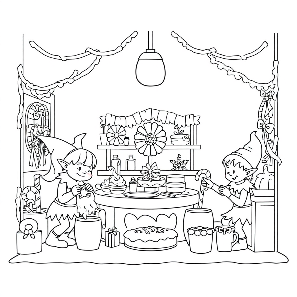 Gingerbread bakery interior with elves icing cookies, candy canes, and steaming cocoa mugs