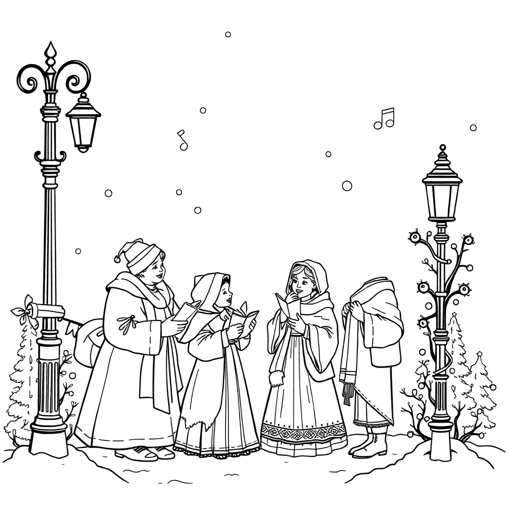 Victorian Christmas carolers singing at a lamppost while snow falls, lantern glow and musical notes