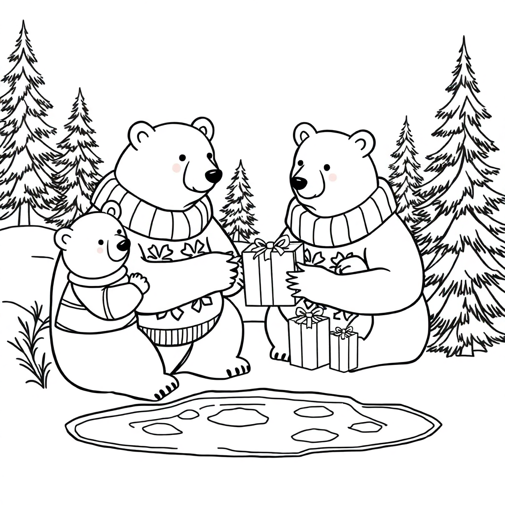 Polar bear family in winter sweaters exchanging gifts beside a frozen pond with evergreen trees